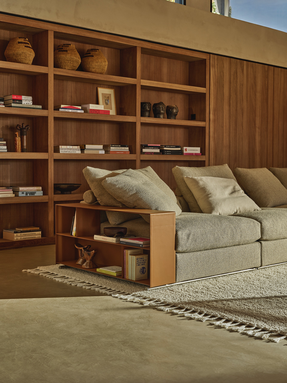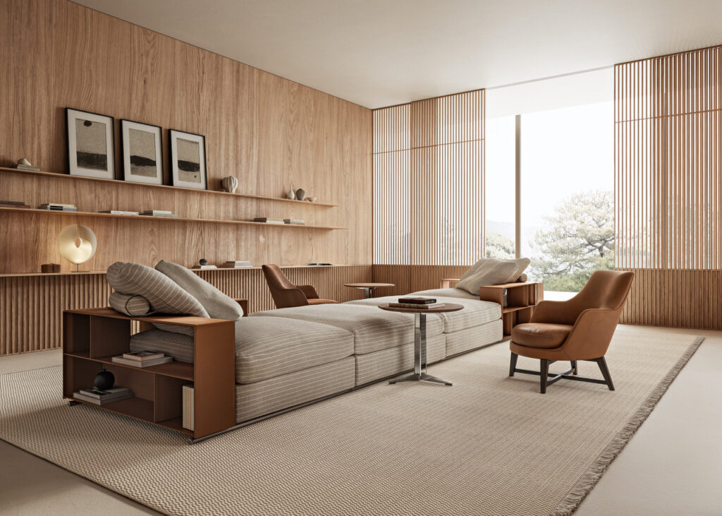 À medida que os estilos de vida se tornaram multifuncionais, o Groundpiece respondeu naturalmente. Já não se trata apenas de um lugar para descansar: nele lê-se, trabalha-se, vê-se televisão, convive-se, e até se janta. Esta transformação levou à reinvenção de um dos seus elementos mais emblemáticos: o braço. Que pode ser tradicionalmente estofado, ou com a forma de uma elegante consola metálica revestida a couro, com prateleiras para apoio e arrumação. Uma solução funcional, um gesto conceptual, uma referência subtil à obra de Donald Judd — um diálogo entre arte, proporção e domesticidade que Citterio prefere sugerir, sem necessidade de explicar.