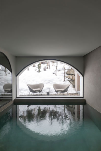 Os espaços exteriores foram pensados como uma continuação natural dos interiores, mantendo um diálogo constante com a paisagem alpina.